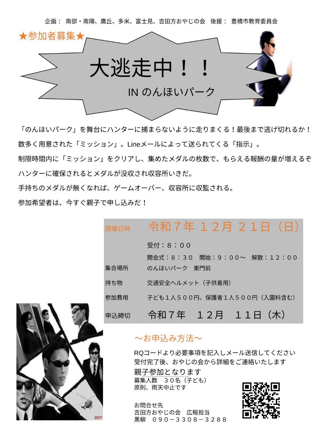 このイベントに当日お手伝いして頂けるお父さん・お母さんも募集中です!! 一緒に楽しみたい!!という方はおやじの会会長青木またはHPの申込み欄からメールにてご連絡ください☆ 第2回のイベントは今流行のフォトロゲイニングを吉田方で開催します♪ 参加希望者は、おやじの会HPの申込フォームより申し込みくださいね。 フォトロゲイニングとは、地図をもとに時間内にチェックポイントを回り、得点を集めるスポーツです。チェックポイントでは見本と同じ写真を撮影者以外全員入れて撮影します。チェックポイントに設定された数字がそのまま得点となり、より合計点の高いチームが上位となります。 ![]() ◎申込時にカテゴリーを明記してください。(男女混合、男子、女子、ファミリー、ベテラン) ◎各カテゴリーの上位チームに賞品があります。 ◎チーム全員一緒に移動してください。 ◎撮影者以外全員を入れて写真を撮らないと得点になりません。 ◎ゆっくり景色を楽しみながら歩いても、高得点狙いに走ってもOKです! ◎全部のポイントを回らなくてもOKです。 ◎昼食会場で豚汁とうどんを用意します。食べずにまわってもOKです。 ◎15時には吉田方小学校に戻ってきてください。 ◎ベビーカーはOKです。自転車やキックボードの使用は不可です。 ◆タイムスケジュール◆ 【10月7日日】 ・9:00 受付 ・9:30 開会式・説明 ・10:00 スタート ・12:00〜13:00 昼食会場にて豚汁とうどん ・15:00 ゴール 集計 ・15:30 閉会式 解散 ◆参加資格◆ ・どなたでも ベビーカー赤ちゃん、車いすのお年寄り、校区外のお友達、愛犬(うんち袋持参)などなど ◆参加定員◆ ・無制限 ◆参加料金◆ ・1人 500円 ※1 昼食付 ※2 未就学児、愛犬は無料です。 ◆参加受付◆ 受付開始日:2018年9月1日(土) 受付締切日:2018年9月25日(火) ◆服装◆ ・動きやすい服装 ・運動靴等歩き回れる靴 ◆持ち物◆ ・デジカメやカメラ機能のある携帯電話、タオル、飲み物等 ◆保険◆ 豊橋市の市民活動総合補償制度に加入しています。 ◆緊急連絡◆ ・有事の際は保護者指定の連絡先に電話します。 ◆アンケート記入◆ ・イベント終了時に簡単なアンケートに記入をお願いします。 ◆注意事項◆ ・有事の際(怪我、病気等)について、主催者はその責任を一切責任を負いません。上記補償制度で対応します。 ・託児所は用意しておりませんので、一緒に歩いて楽しんでください。途中どこで休憩されてもOKです。 ・手荷物置場の用意はありません。最小限の荷物でお越しください。 ・イベント参加に際しては、HPの申込規約に同意の上で、お申し込みください。 ◆申込規約◆ 1.主催者は、参加者の疾病や手荷物紛失、その他の事故に際し、応急処置を除いて一切の責任を負いません。 2.年齢・性別の虚偽申告、申込者本人以外の参加(不正参加)は認めません。 3.事業中の映像・写真・記事・申込者の氏名、年齢、住所(国名、都道府県名または市区町村名)等のテレビ・新聞・雑誌・インターネット等への掲載権と肖像権は主催者に属します。 4.主催者は、個人情報の保護法令を遵守し、参加者の個人情報を取り扱います。 5.アレルギー等の情報は参加申し込み時に必ず情報開示してください。 ◆警備、防犯◆ 1.交通誘導・警備は行いません。各自で交通安全には十分注意してください。 2.仲間とはぐれて迷子にならないよう、必ずチームで行動してください。 ◆個人情報について◆ 主催者は個人情報の重要性を認識し、個人情報の保護に関する法律及び関連法令等を遵守し、主催者の個人情報保護方針に基づき、個人情報を取り扱います。イベント参加者へのサービス向上を目的とし、参加案内、関連情報の通知に利用いたします。 ※主催者から申込内容に関する確認連絡をさせていただくことがあります。 |